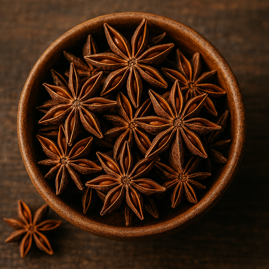 Star anise has a sweet, licorice-like flavor, used in both sweet and savory dishes. It also has antimicrobial and digestive benefits.