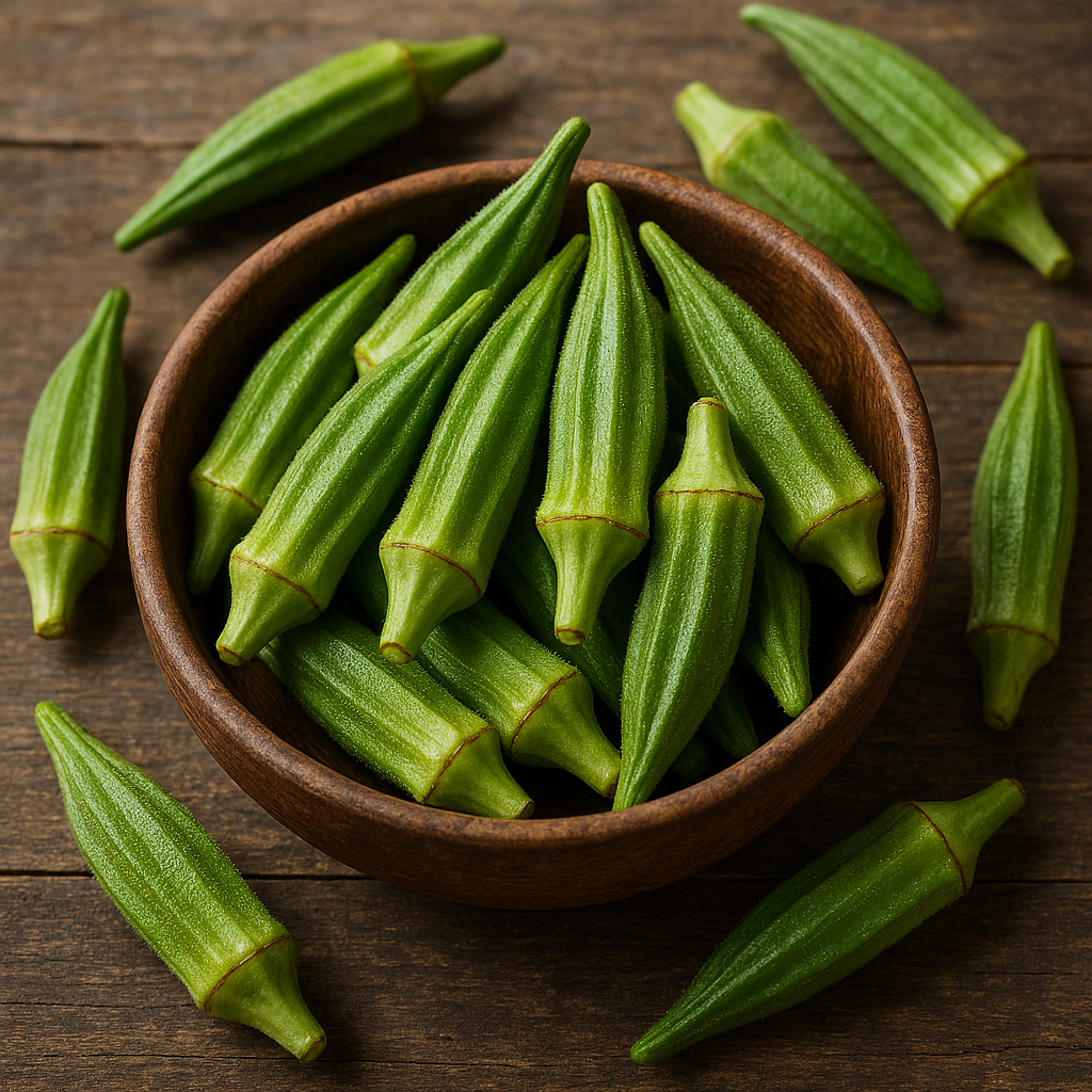 Okra is a nutritious vegetable high in fiber and vitamins. It is commonly used in soups, stews, and fried dishes.
