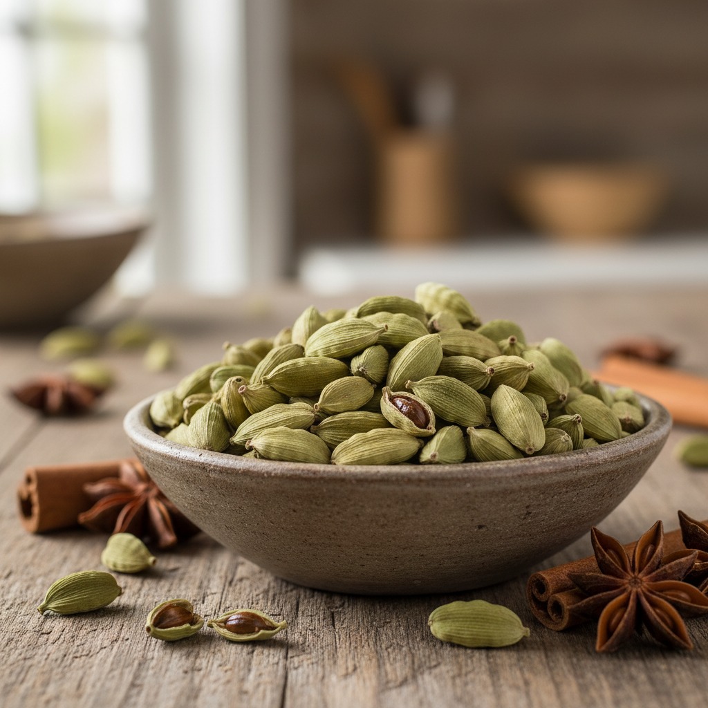 Cardamom has a sweet and aromatic flavor, often used in desserts and teas. It aids digestion and has antimicrobial properties.