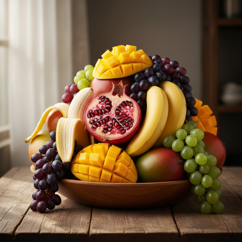 Fruits like pomegranate, banana, grapes, and mangoes are rich in vitamins and antioxidants that boost overall health. They provide natural sweetness and essential nutrients for a balanced diet.
