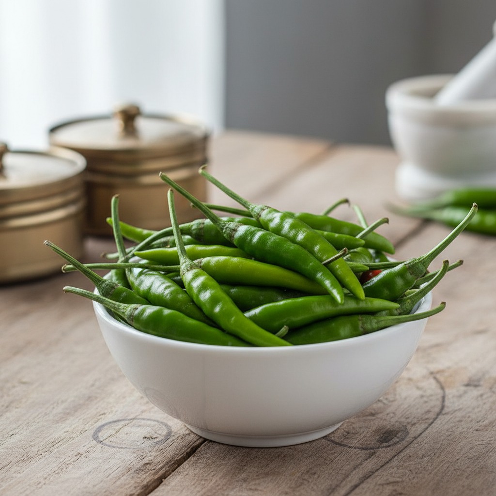 Green chilies add heat and flavor to dishes, enhancing taste and aroma. They are rich in vitamin C and capsaicin, which boosts metabolism.